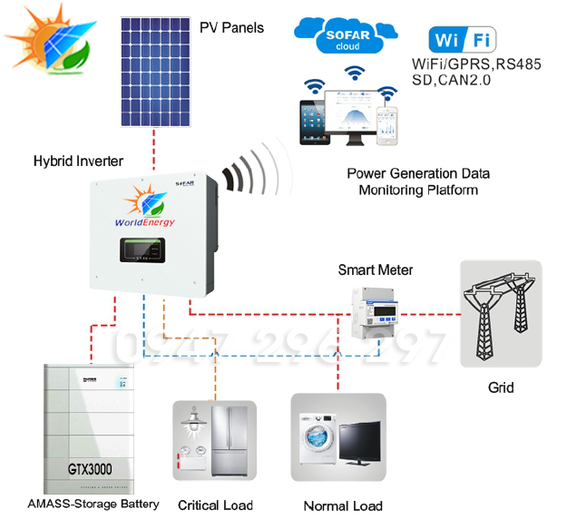 - Điện thu được từ tấm pin mặt trời (Solar Panel) là điện 1 chiều, qua bộ Hybrid Inverter có chức năng đổi từ điện DC – AC cùng pha cùng tần số với điện lưới, sau đó hệ thống sẽ hòa chung or độc lập với điện lưới