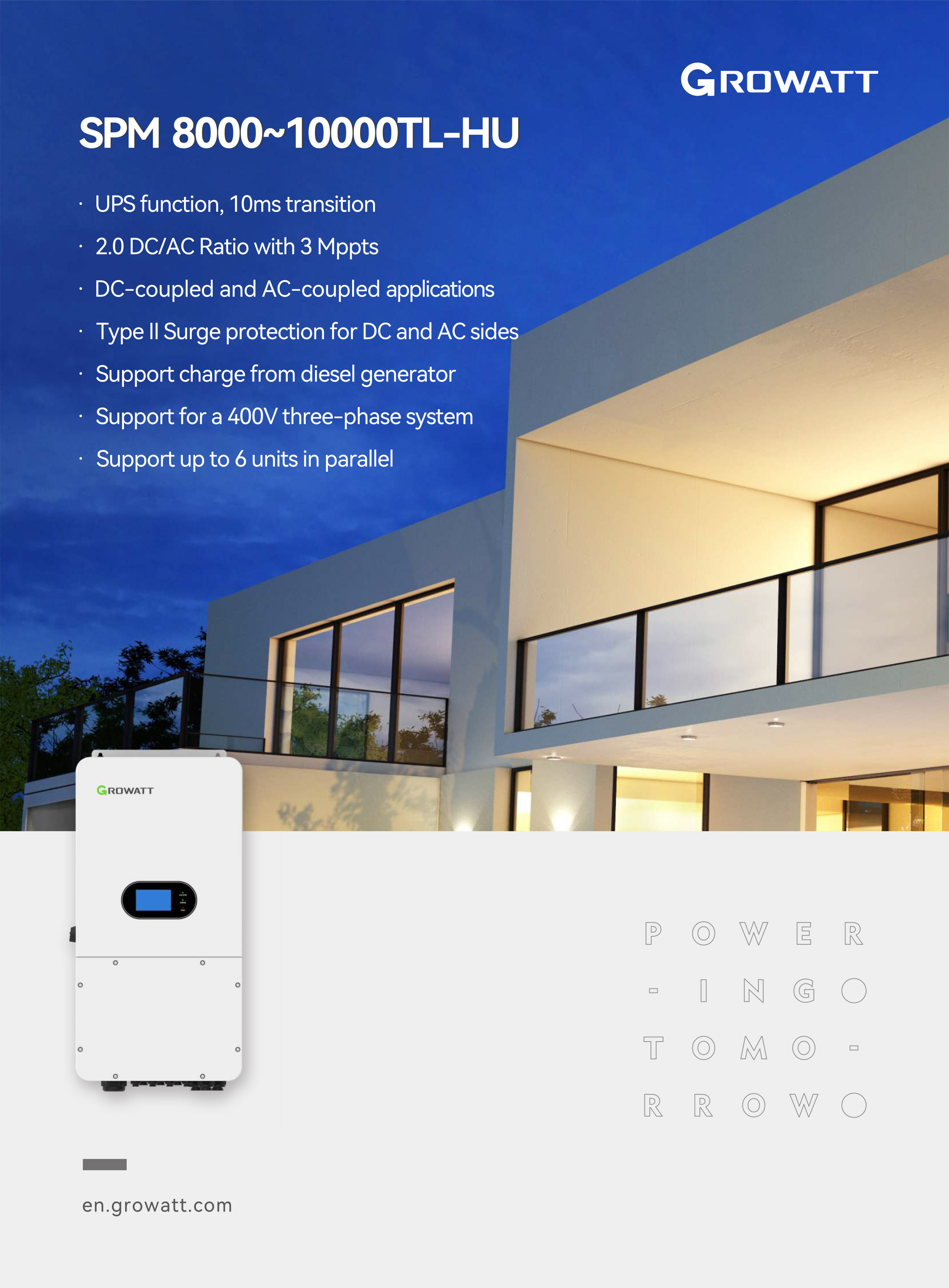 Growatt SPM 8000TL-HU là biến tần hybrid 1 pha công suất 8kW, hỗ trợ pin lưu trữ điện áp thấp, có chức năng UPS chuyển mạch 10ms, đến 3 MPPT, hiệu suất tối đa 97,5%, tương thích hệ DC/AC-Coupled, hỗ trợ máy phát và pin lithium hoặc axit. Thiết kế chuẩn IP65, phù hợp lắp ngoài trời, mở rộng linh hoạt.