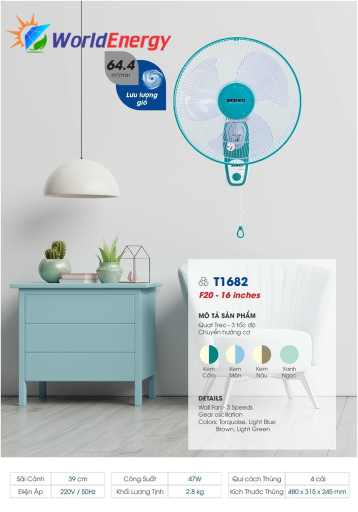 Quạt Treo SENKO T1682 là sản phẩm của tình thần sáng tạo được treo mọi vị trí thích hợp trong không gian sống của bạn, được thiết kế từ nhựa giúp sản phẩm cách điện, cứng, bền khi tiếp xúc với nhiệt độ cao.
