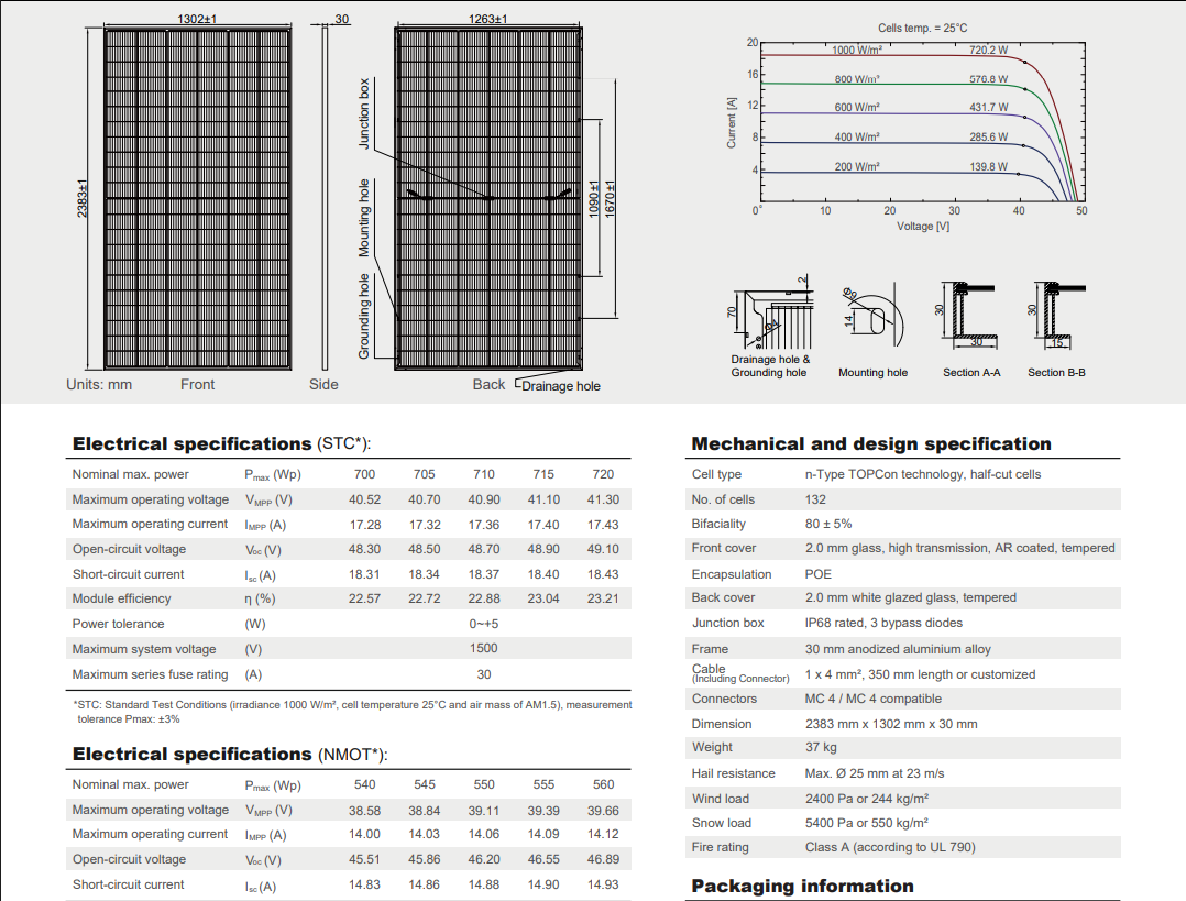 2. Thông số kỹ thuật của tấm pin AE Solar 710W (Double Glass Bifacial)